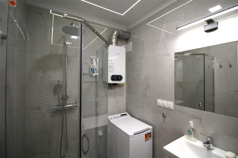 - przestronna łazienka z prysznicem i pralką, ciepła woda – nowy gazowy przepływowy podgrzewacz wody