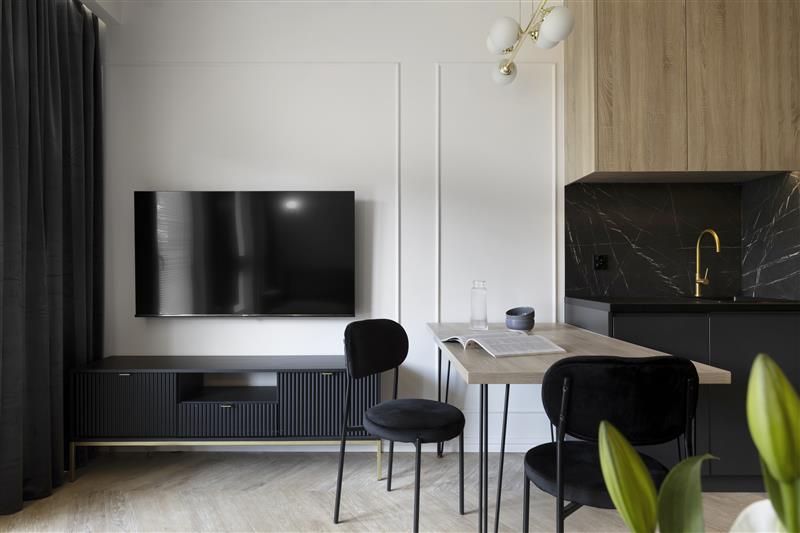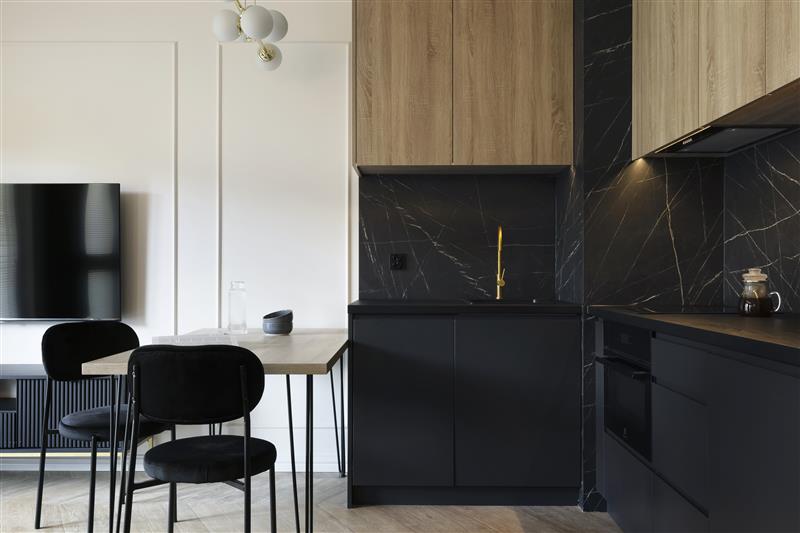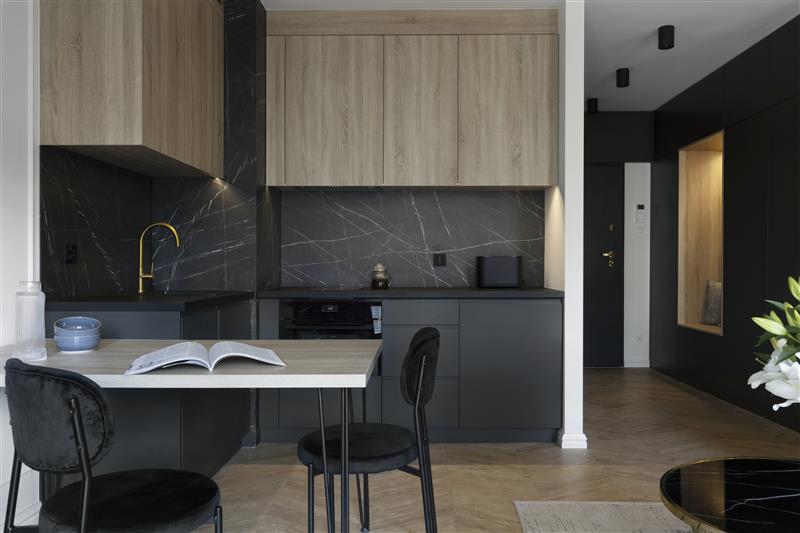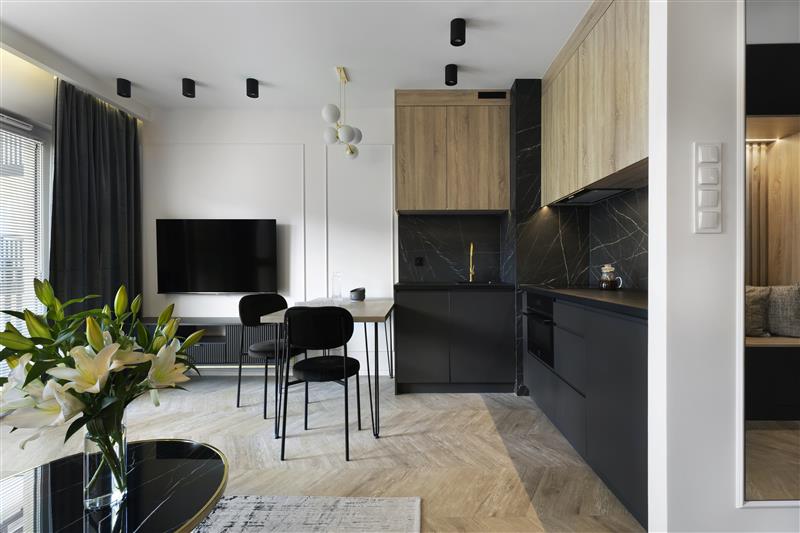 Mieszkanie jest wykończone w wysokim standardzie, w nowoczesnym stylu, z dbałością o detale.